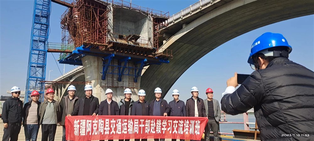 新疆阿克陶县交通运输局赴赣学习交流培训班一行先是参观了大桥河西预制梁场,详细了解预制梁场建设规模、运行模式等情况,随后来到大桥施工现场,对主桥施工工艺、难点问题展开了深入交流讨论。
