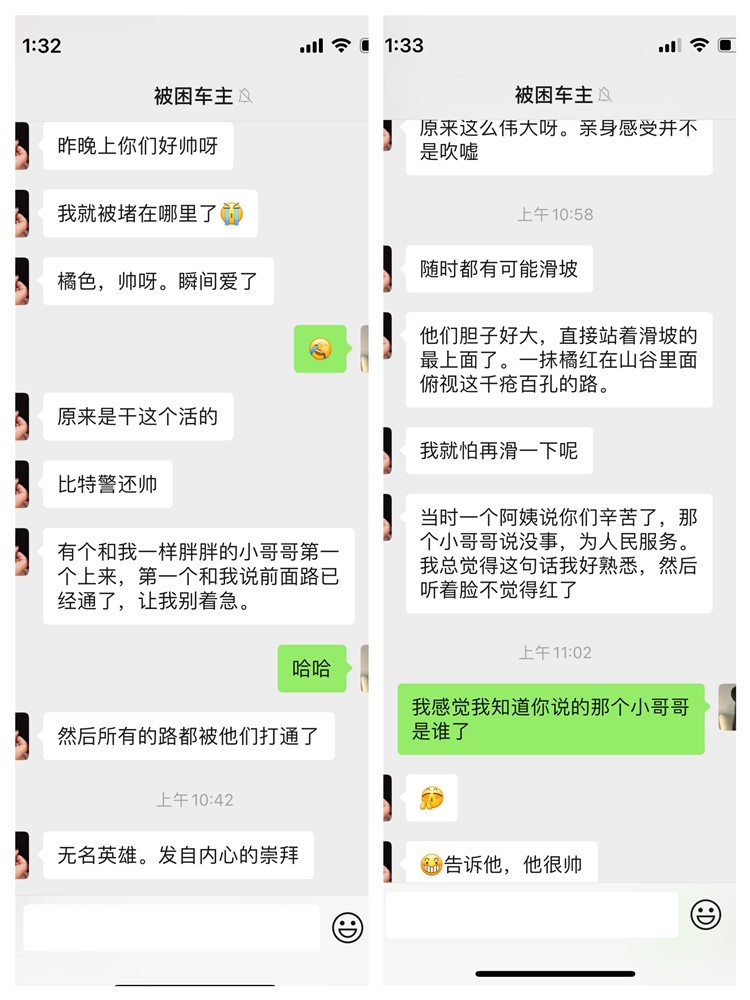 “橘色,帅呀,瞬间爱了;深夜里,一抹橘红在山谷里面俯视这千疮百孔的路,无名英雄,发自内心地崇拜,亲身感受到才明白这并不是吹嘘”,被困车主这样说道。而面对这样的感谢,“小哥哥”腼腆的笑了,只说了一句:“为人民服务!”