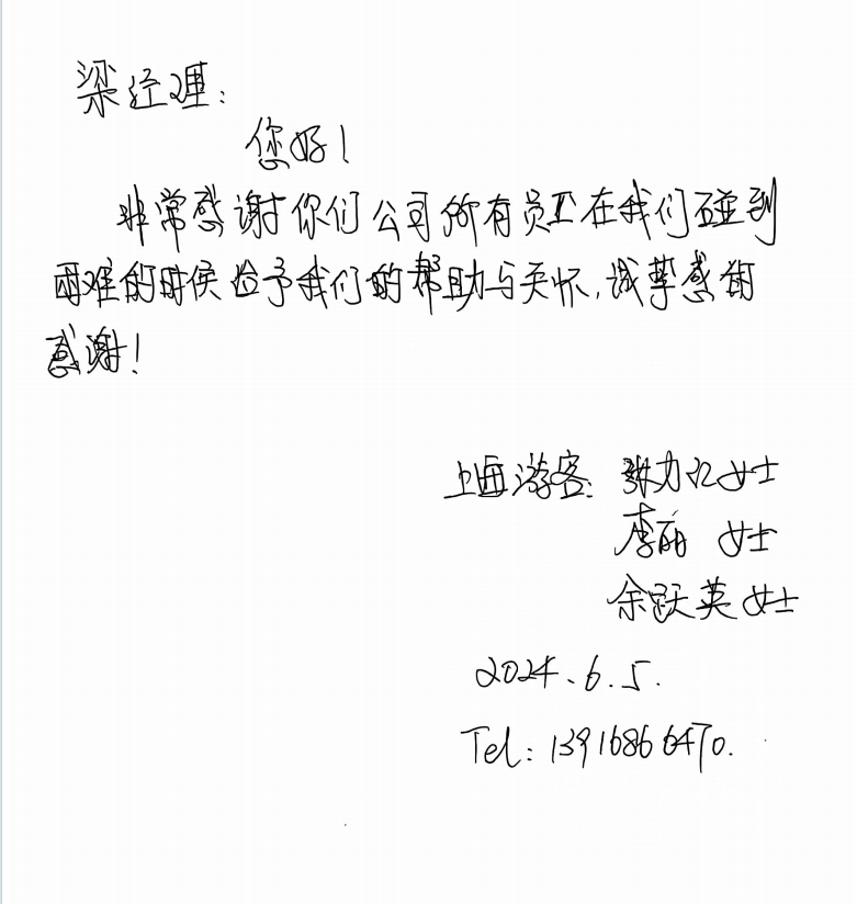 项目部了解情况后,热心帮助三位游客在项目部用午饭、休息,等待车辆维修。当天下午,车辆修理好后,准备离开,游客临走前留下一封感谢信并且感激的说到:“特别感谢!要不是你们提供帮助,我们中午不仅要饿肚子,还要在烈日下等待很长时间,在这没有水喝食物的地方后果不敢想象,非常感谢在我们遇到困难时提供的午餐和热心帮助”。(酒泉通达路桥有限责任公司柳敦高速公路日常养护项目经理部:梁旭、吴佳燕)