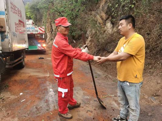 养护人员顶着刺鼻的柴油味,展开行动。先用铁锹将锯木屑均匀铺洒吸附油污,再用扫帚反复清扫湿滑路面,经过2个多小时连续奋战,19时14分路面恢复洁净,滞留车辆有序通行。货车司机王师傅紧握养护人员的手:“多亏你们来得快,不然节假日再出事故我这心里过不去啊!”“路上有隐患,我们必须在!”简短的回答道出公路人的坚守。