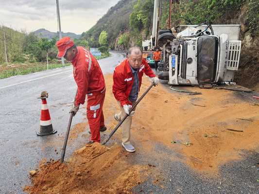 16时33分接到报案通知后,正在冒雨巡查的值班人员10分钟内火速抵达现场,发现该路段有一辆货车侧翻在路面,汽油混合雨水流了一地,对于油污混杂雨水的“隐形陷阱”,值班人员立即启动应急预案,一边设置警示标志引导车辆绕行,一边紧急调集周末轮休的5名养护人员携20袋锯末到现场处置。