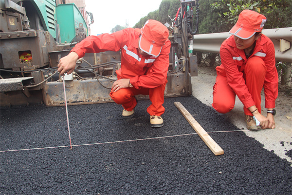在混合料生产过程中,河口公路分局谨小慎微,通过多次试验确定了最佳生产参数,严格控制SBS改性剂的添加量、拌和温度和搅拌时间,确保改性剂均匀分散在沥青混合料中,从而保证了混合料的质量。施工时在碾压上也不敢掉以轻心,采取“双钢轮+胶轮”压路机联动作业,严格按初压、复压、终压三阶段实施阶梯式碾压。施工过程中,技术人员全程跟踪混合料的摊铺温度及摊铺状态,动态调整碾压速度与遍数,确保施工质量。