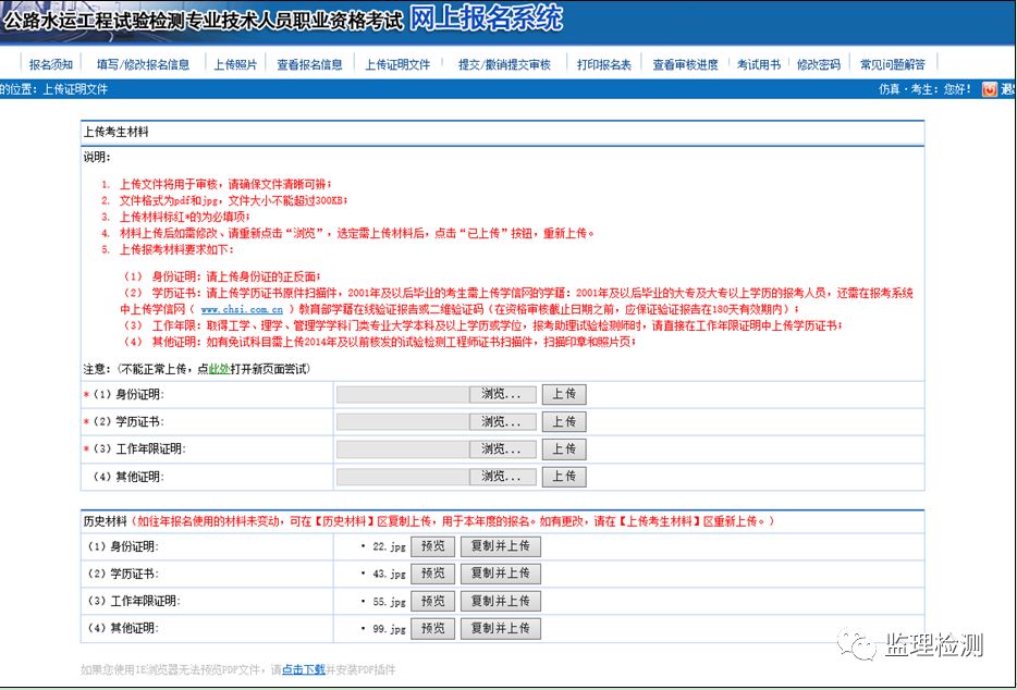 点击菜单区“上传证明文件”进入上传区,上传文件的要求如下: