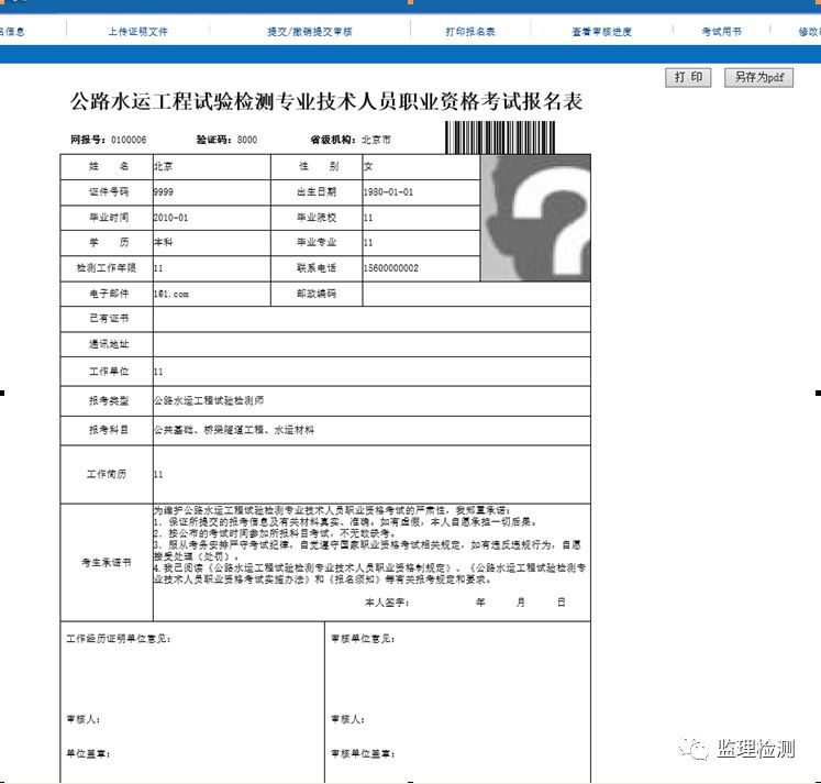 点击“打印”,系统将报名信息以表格形式显示,考生可根据实际情况进行打印或另存为pdf格式。