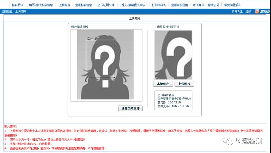 点击页面上的“选择图片文件”按照红色方框中的尺寸剪切一个图片,点击“上传照片”按钮。如图(3-3-1)。如有问题:查看下边红色提示。