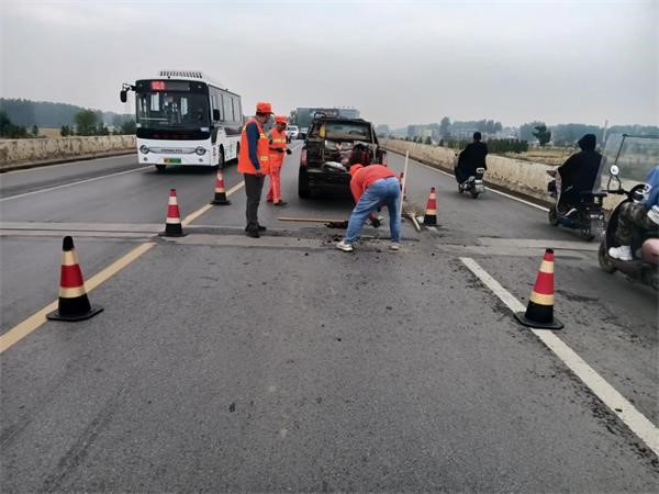 为保障道路的安全畅通,消除安全隐患。5月12日,阜南公路分局组织专业施工队伍修复桥梁伸缩缝。施工人员到达现场,首先对修复位置设置警示标志标牌、锥形桶等交通安全设施封闭部分车道,并安排人员对过往车辆进行交通疏导,减少车辆拥堵;其次凿除并清理破损的混凝土、校正变形钢筋;然后填、补整平并压实沥青混凝土冷补料,最后开放交通。