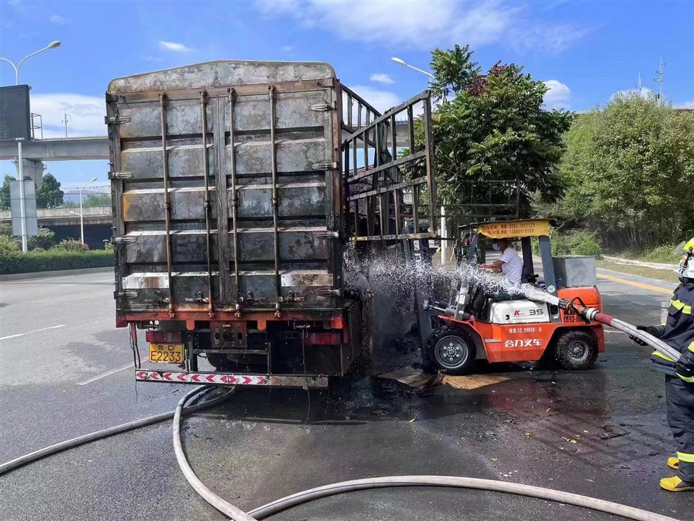 “您好,紫泥高速K1左右往厦门方向有一辆拉纸皮的车,车子货厢着火了,着火的纸板一路洒落在路侧及边坡,请立即组织人员赶处置”。10月15日11时10分,漳州港养护站接到信息指挥指挥中心电话,情况紧急,养护站立即组织人员赶往现场。