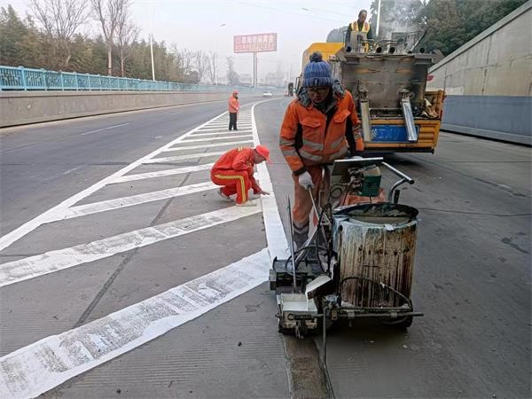 1月6日起,中心利用晴好天气,组织专业施工队伍进行标线补划,施工队伍到达施工现场后,严格按照程序进行施工。一是根据道路的宽度,交通状况等因素,合理布置施工标志、反光锥等安全防护设施,安排专职人员指挥交通,防止出现交通拥堵和交通事故;二是将补划标线位置的路面清理干净;三是进行放样和涂刷粘结剂,做好基准线,进行试划,检查标线色泽和玻璃珠撒布情况,符合要求后才继续施划;四是待施划的振荡标线冷却至常温后开放交通。