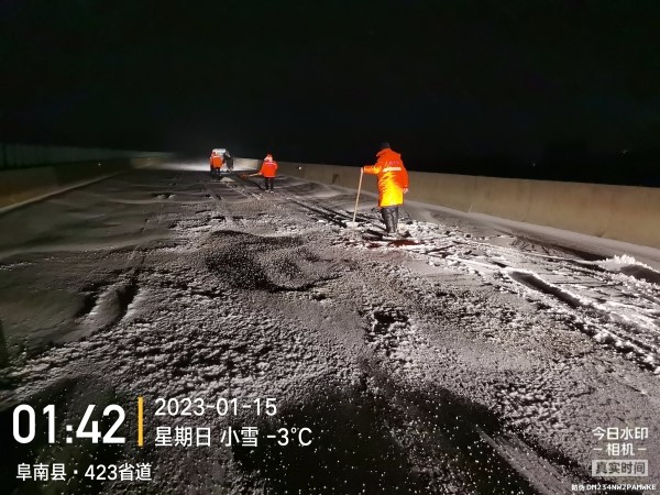 截至1月15日凌晨4点,阜南公路中心已出动人员60人次,巡查车辆2台次,融雪剂抛撒车4台,撒布融雪剂和工业用盐80吨,基本清除了辖区干线公路的路面积雪冰冻情况,公路人不畏严寒,迎雪而战,有力保障了辖区道路安全畅通和行人行车安全,展现了新时代公路人的风采。