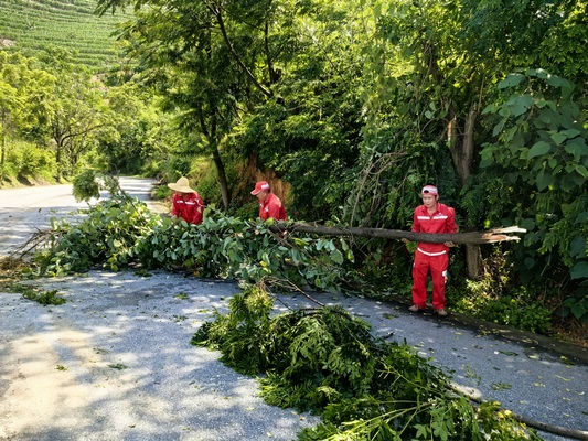 S209线绿荫变路障。 昔日挺拔的行道树,在暴雨中树木轰然折断、倾倒,散乱的枝丫斜插在路面上,瞬间成为通行障碍。应急队员立即响应,油锯轰鸣切割树干,搬运号子此起彼伏,众人合力快速清理出安全通道。