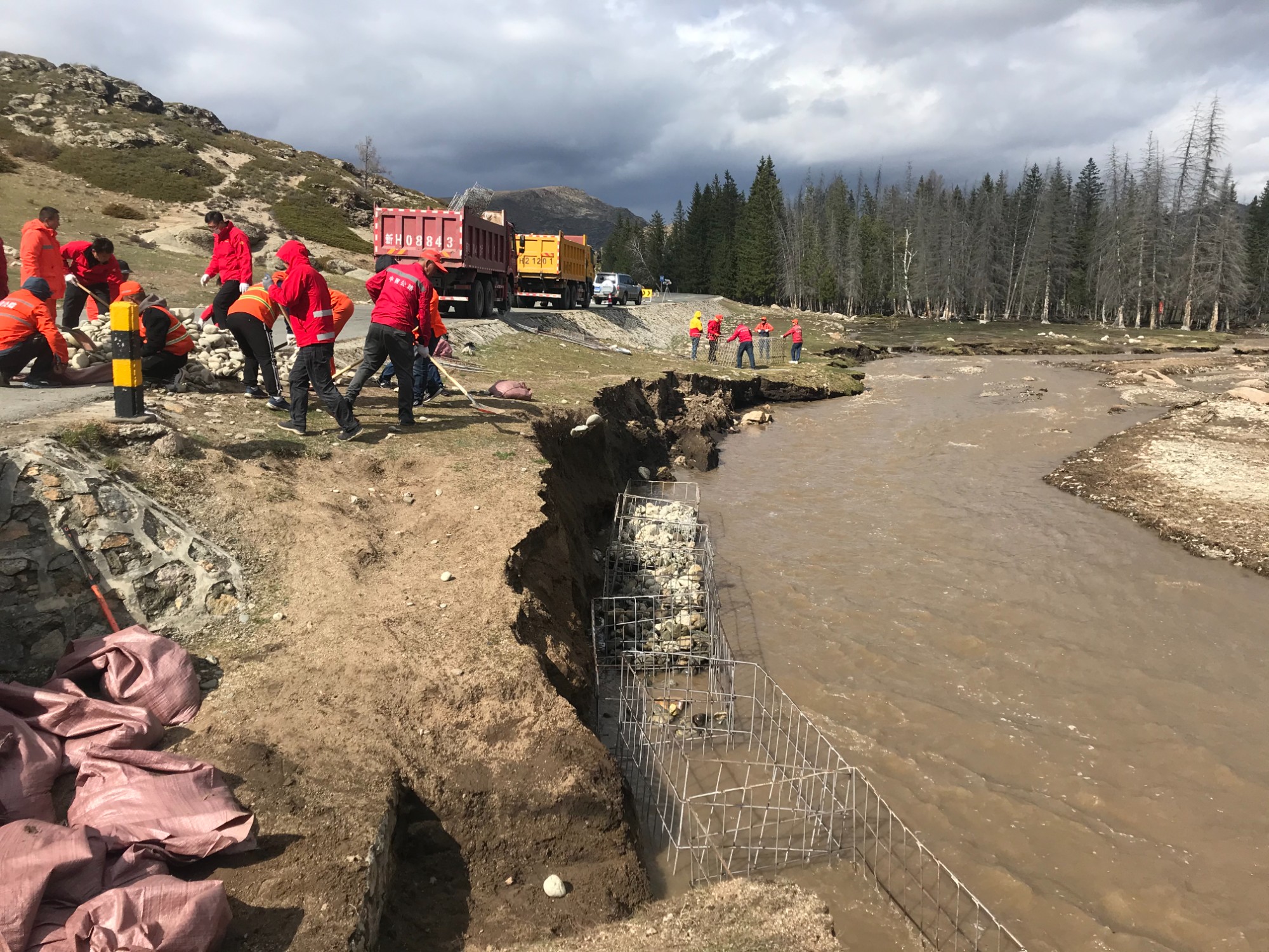 为确保五一期间道路通行质量,分局及时启动水毁抢险应急预案,共组织抢险人员22人,出动抢险机械6台,拉运钢筋笼、鹅卵石等前往事发地点。到达现场后,迅速分工,部分抢险队员站在水中,接过钢筋笼并放置水底;其他抢险队员将鹅卵石放入水中的钢筋笼。虽然山里气温低,水温低,任务重,但是干部职工们不畏艰难,分工协作、积极配合,发扬阿勒泰公路人“金山铸道、雪域争锋”精神,经过前后8个多小时的奋勇战斗后,共摆放钢筋笼29个,投放鹅卵石约150余方,筑起一道“钢筋笼鹅卵石防洪墙”,有效消除了山洪冲击路基隐患。